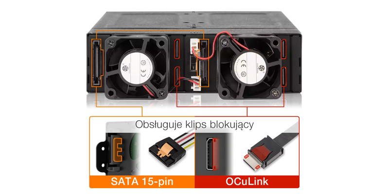 | • | Obsługuje kable SATA 15-pin i OCuLink z zatrzaskiem blokującym dla bezpiecznego połączenia |