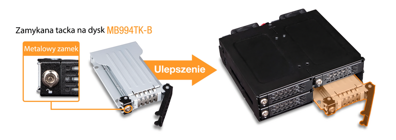 | • | zatrzask tacki typu Eagle-hook, który bezpiecznie utrzymuje tackę napędu wewnątrz obudowy |