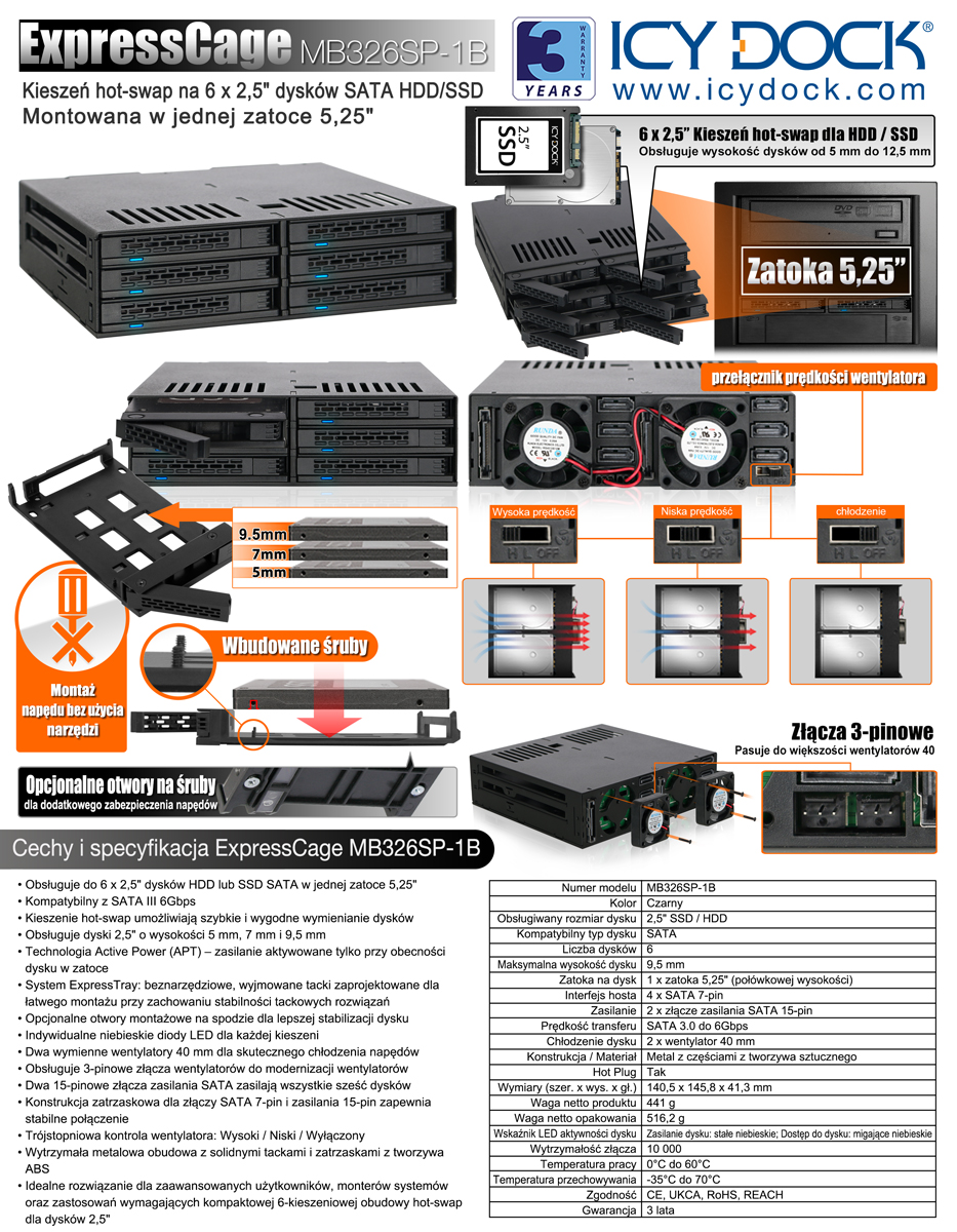Uwaga: ExpressCage MB326SP-1B nie obsługuje dysków SAS HDD/SSD, które również wymagają zasilania 12V.