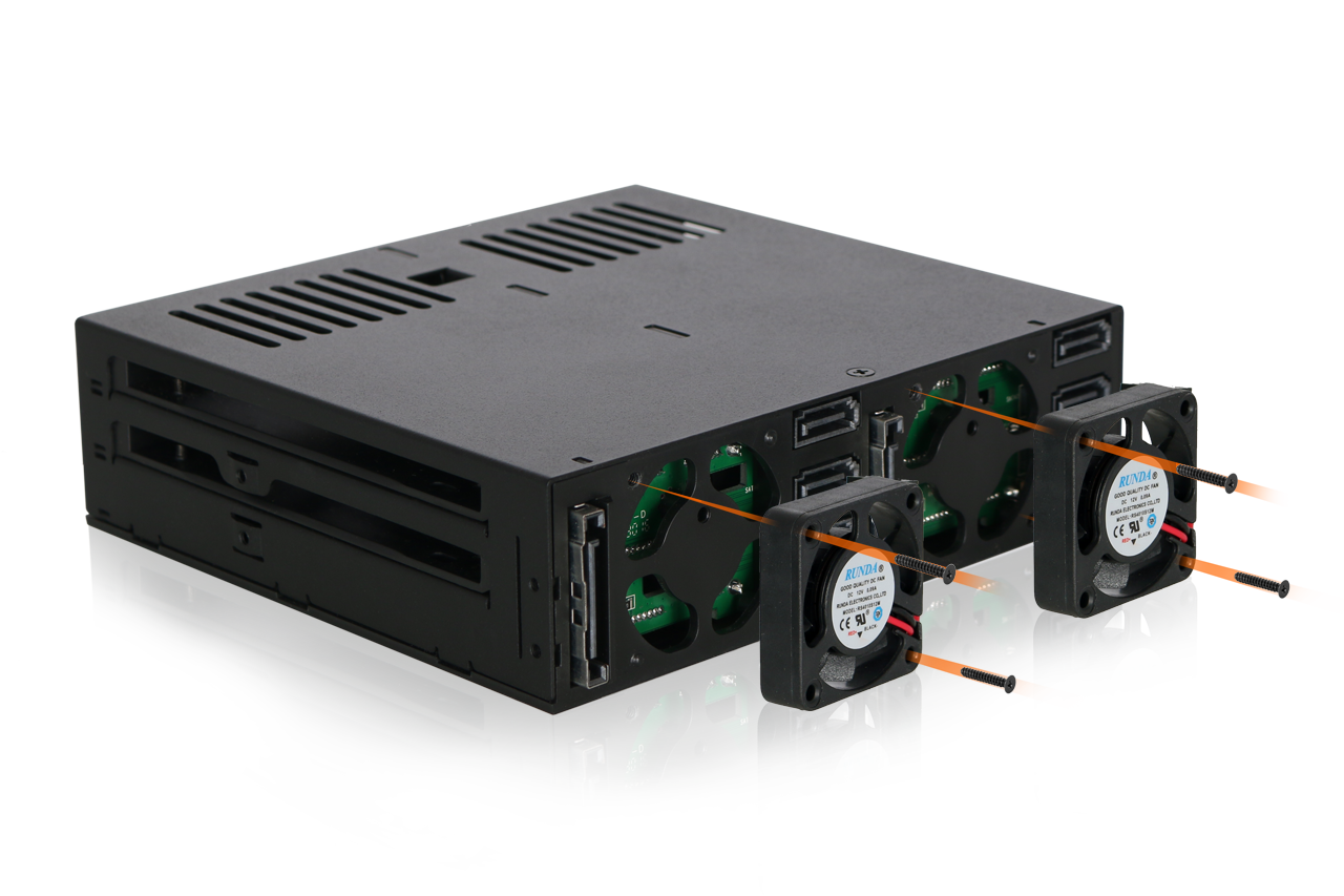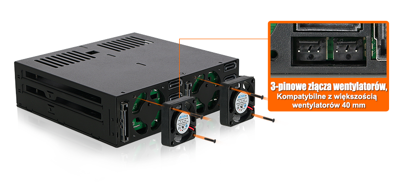 | • | Dwa wymienne przez użytkownika wentylatory 40mm zapewniające skuteczne chłodzenie dysków |