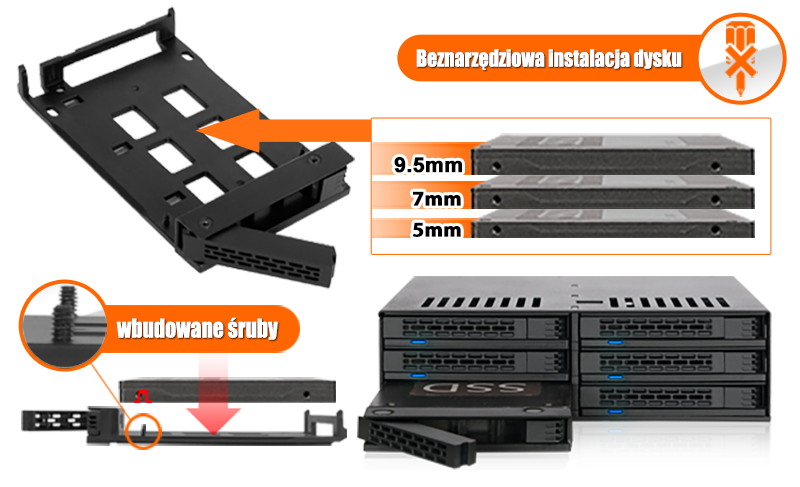 | • | Obsługuje dyski 2.5" o wysokości 5mm, 7mm i 9.5mm |