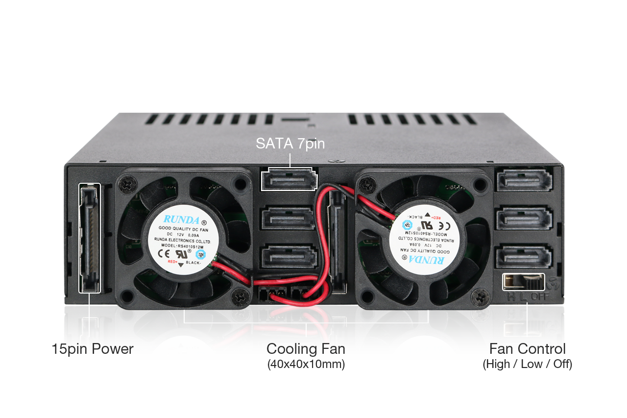 Aby poradzić sobie z wymaganiami termicznymi sześciu dysków, model MB326SP-1B jest wyposażony w dwa tylne wentylatory chłodzące 40 mm, wspierane przez otwory wentylacyjne wokół obudowy i kieszeni. Użytkownicy mogą wybierać spośród trzech trybów pracy wentylatora za pomocą przełącznika suwakowego: