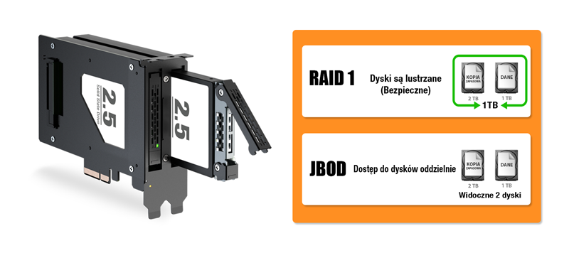 | • | Wbudowana obsługa PCIe RAID 1 / JBOD dla ochrony danych lub elastycznej konfiguracji pamięci masowej |