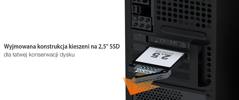 | • | Obsługuje 2 × 2.5" SATA SSD/HDD (do 9,5 mm wysokości) |