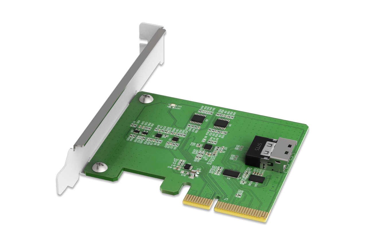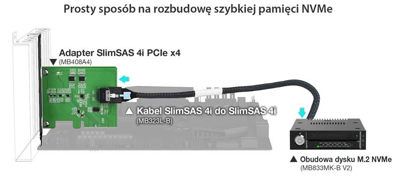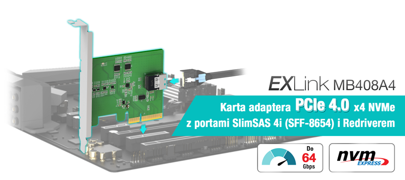 | Interfejs endpoint: | 1 x SlimSAS 4i (SFF-8654), pin-out zdefiniowany przez SFF-9402 Rev 1.1 (kompatybilny z kartami Tri-Mode HBA/RAID) |