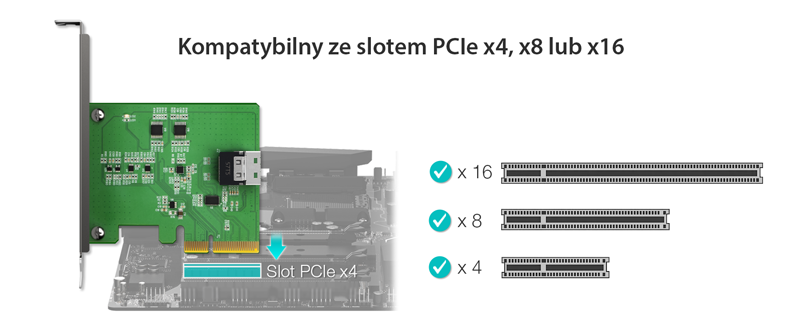 | Obsługiwane gniazda: | Współpracuje z gniazdami x4 PCIe 2.0/3.0/4.0 lub 5.0 na płytach głównych |