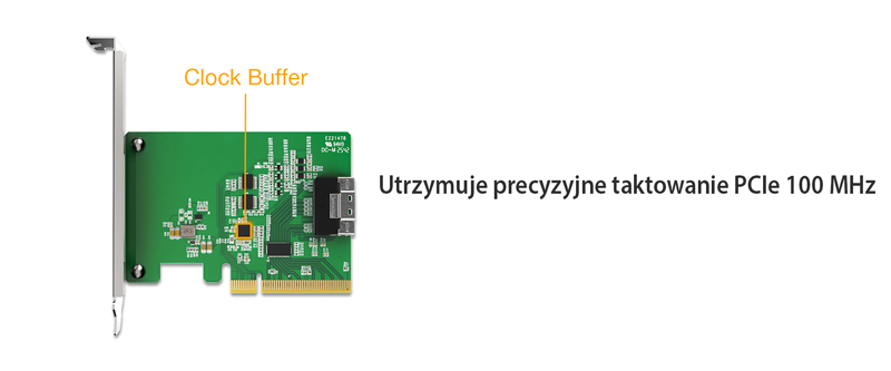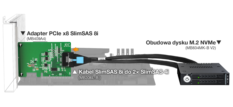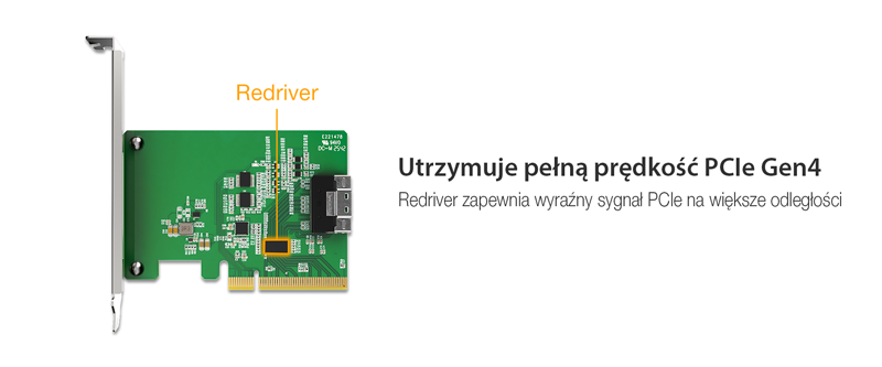 | Interfejs endpoint: | 1 x SlimSAS 8i (SFF-8654), pin-out zdefiniowany przez SFF-9402 Rev 1.1 (kompatybilny z kartami Tri-Mode HBA/RAID) |