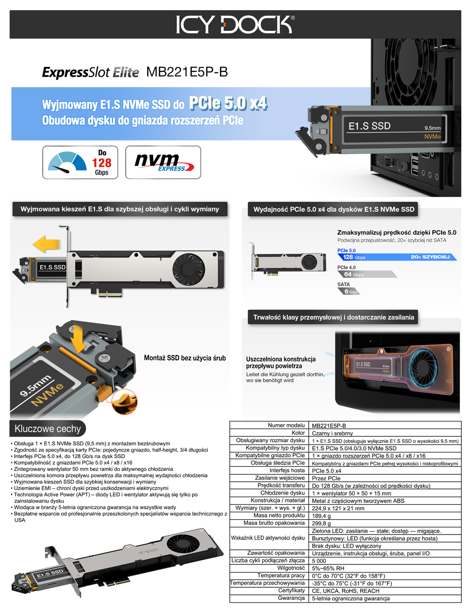 | Kompatybilny typ dysku: | E1.S PCIe 5.0/4.0/3.0 NVMe SSD |